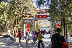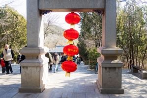 2026年2月,青州云门山的石构门庭间,四盏红灯垂悬,“招财进宝” 的吉语醒目。框景构图下,游人往来于葱郁林木间,古建的厚重与年节的红火相融,定格新春登高的喜庆氛围。