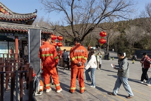 2026年2月,晴日里,青州云门山的古建与红灯间,森林消防队员的橙色身影格外醒目。游人往来,年味正浓,他们以坚守为盾,守护着这片福境的安宁。