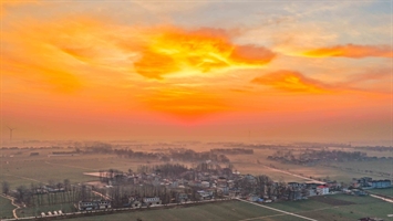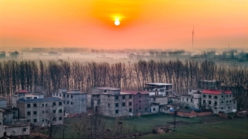 晨雾漫乡野,日出染橙霞