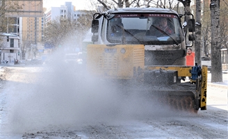 雪色清晨,环卫工人用铲雪车清理路面——王童摄