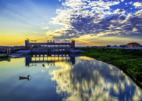 夕河舟影伴霞归