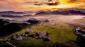 《晨雾染乡野,霞光照远山》
