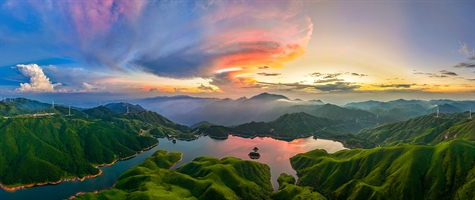 《霞光映照绿色生态天湖》