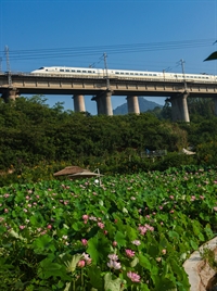 动车驶过荷塘边