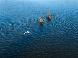 广东省广州市珠江,一位长者仰浮在江面,不远处,一位小男孩正脚踩水翼板驰骋。