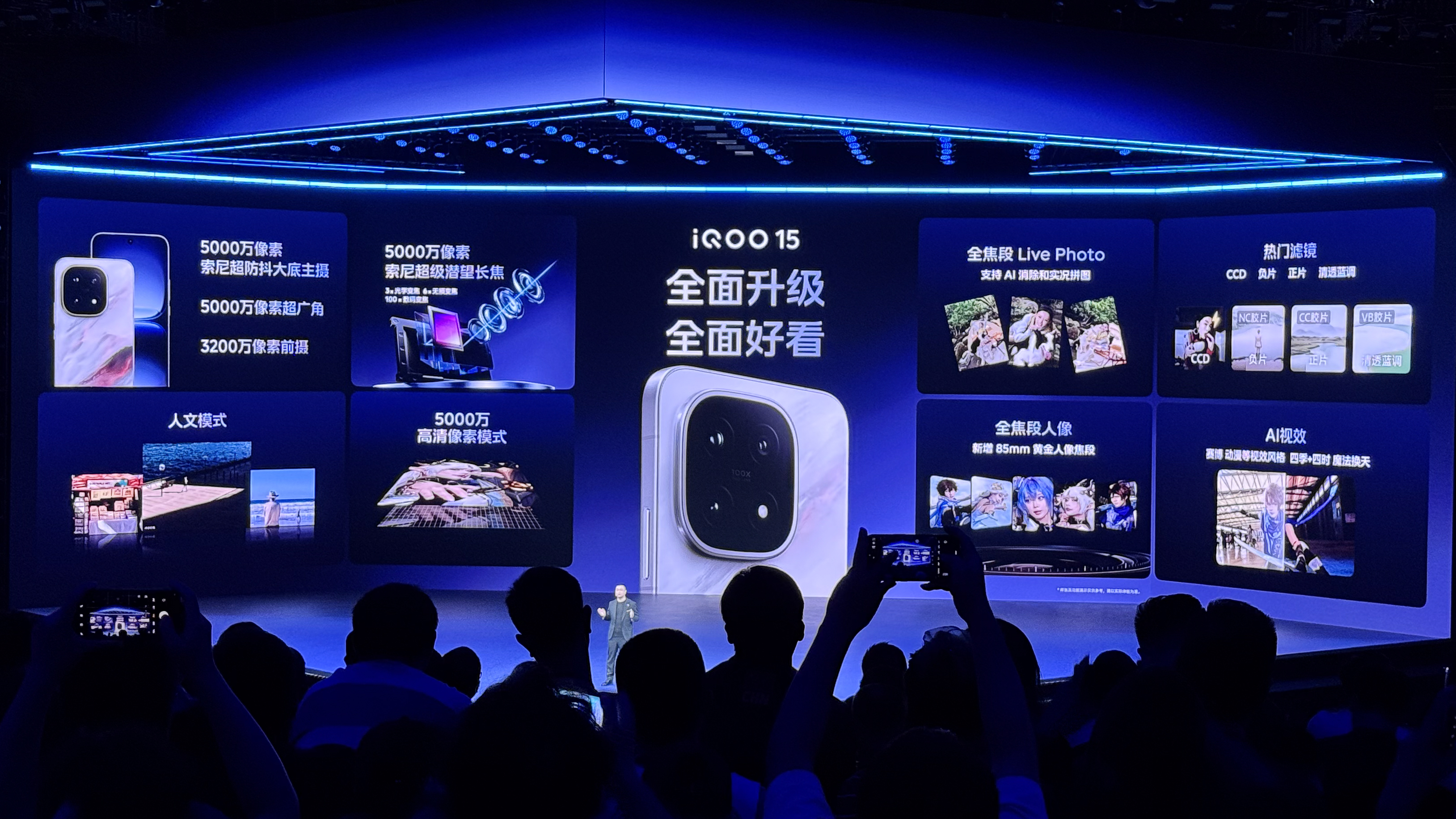 全面升级,全面好看。iQOO 15 配备后置 5000 万像素索尼超防抖大底主摄、5000 万像素索尼超级潜望长焦和 5000 万像素超广角以及3200 万像素前置镜头,并得到蓝厂旗舰同款 NICE 算法和大模型画质增强双重技术加持,拍摄出来的照片细节更清晰,大片感十足。另有全面升级的全焦段 LivePhoto、高像素模式、全焦段高像素人像模式和 AI 视效等影像玩法,用 iQOO 15 拍风光拍人文,全面好看。