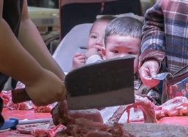2024年6月2日拍于青岛。说明:小区体育街上,一位男孩身着整洁的民族学生制服,神情专注地拉着一车摆放整齐的朝鲜族特色面饼。身后的母亲与阿姨穿着传统朝鲜族服饰,步履匆匆,赶往夜市,这是她们第一次出摊。