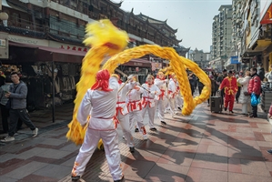 夜幕降临,徽州古城内红灯笼与古建筑相映成趣,多支鱼灯表演队伍从主街出发。烛火摇曳的鱼灯在人群中缓缓涌动,沿街巷有序前行,吸引大批游客跟随观赏、拍照,现场热闹非凡。不少游客看完表演后,顺着热闹的动线走进国风市集,原本就充满烟火气的市集更添人气,各摊位前很快挤满挑选商品的游客,“表演聚客、市集消费”的联动效应逐步显现。