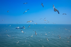 2026年1月11日早晨,月挂当空,一群天鹅飞翔在怀远县大河湾的上空。近年来,随着环境的不断改善,越来越多的鸟类来到这里过冬。