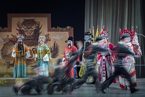 2026年2月17日,拍摄于河北省唐山市丰南区河头老街景区,唐王东征剧场正在上演刀马旦与打铁花表演。金辉落满河面,人间烟火正浓。